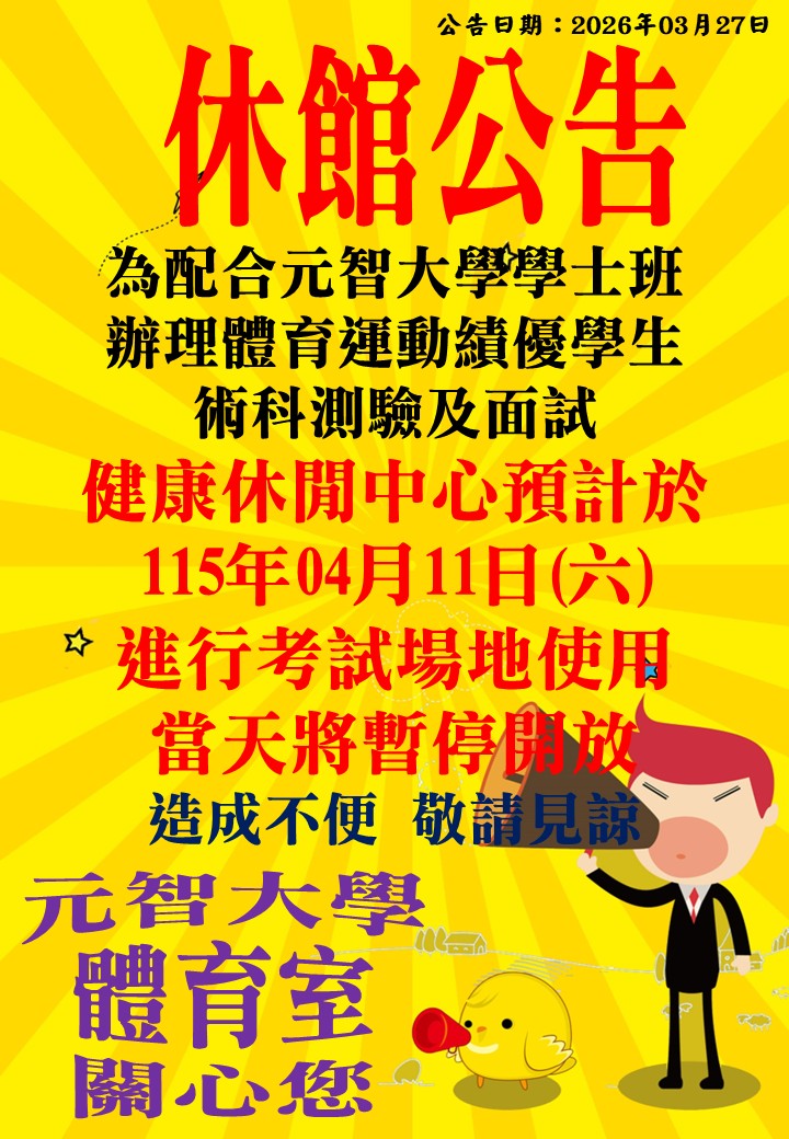 健康休閒中心配合辦理體育運動績優學生術科測驗及面試,預計於4月11日(六)休館一天。