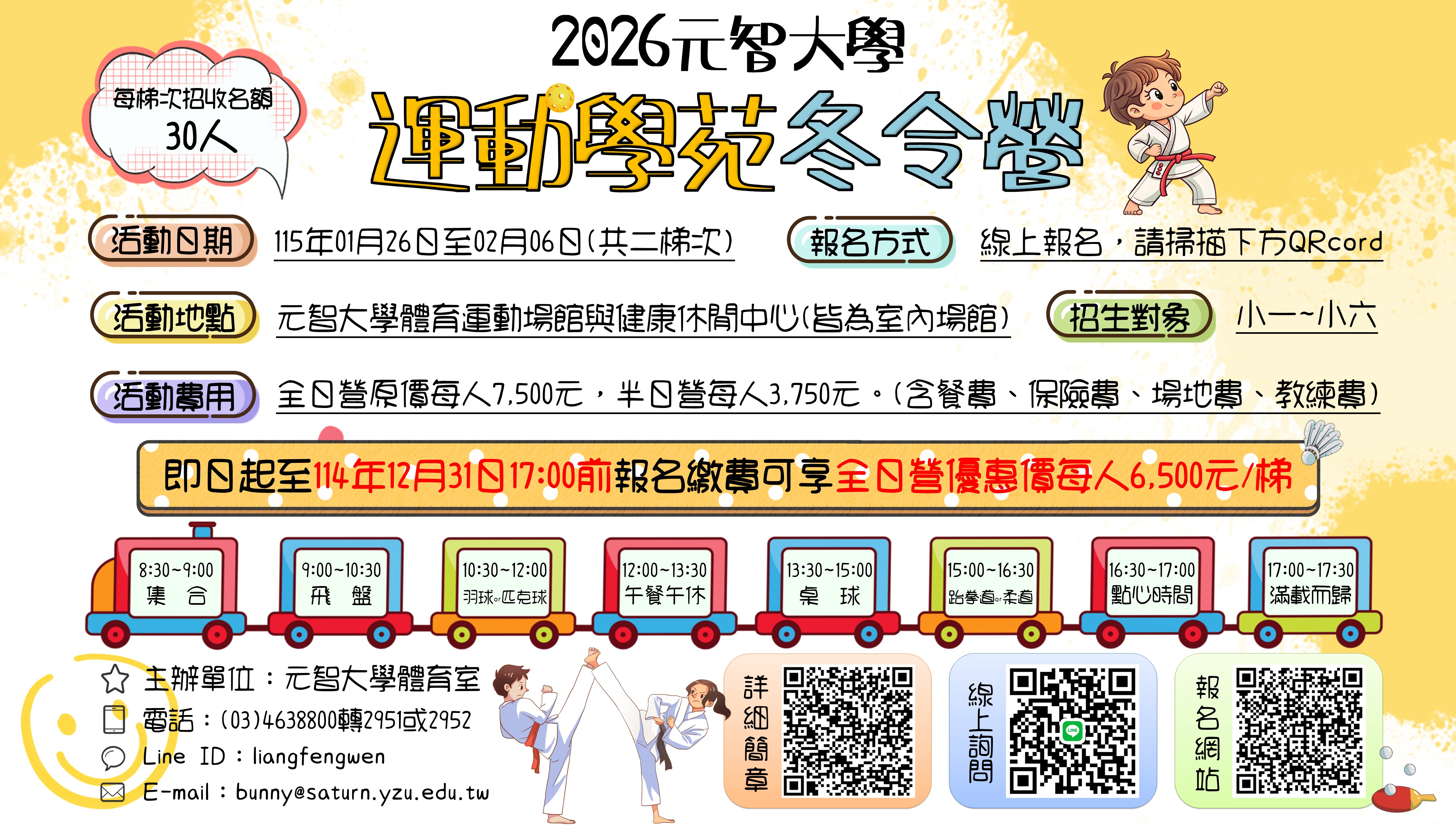 十、報名方式:請先填寫2026元智大學「運動學苑」冬令營線上預約報名系統。